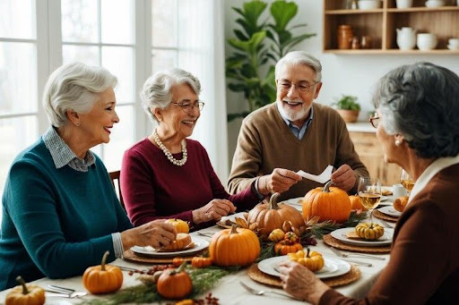 To celebrate, we’re gathering around our cozy dining table for a traditional feast with all the fixings—turkey, stuffing, pumpkin pie, and warm conversation—just like family.